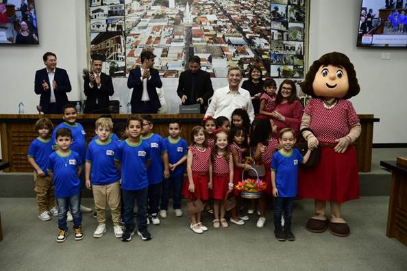 José Roberto Colnaghi e Maura Fatori, diretora da Fundação, com formandos e a mascote de Dona Nelly. (Foto: Câmara Municipal de Penápolis)
